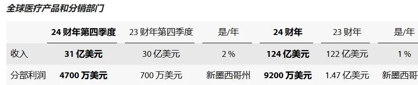 医疗产品部门实现营收124亿美元,约占5%左右;利润9200万美元,同比下滑了34%。